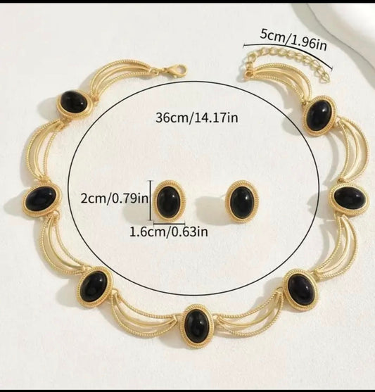Gjerdan elegant me gurë ovalë të zinj dhe vathë që përputhen